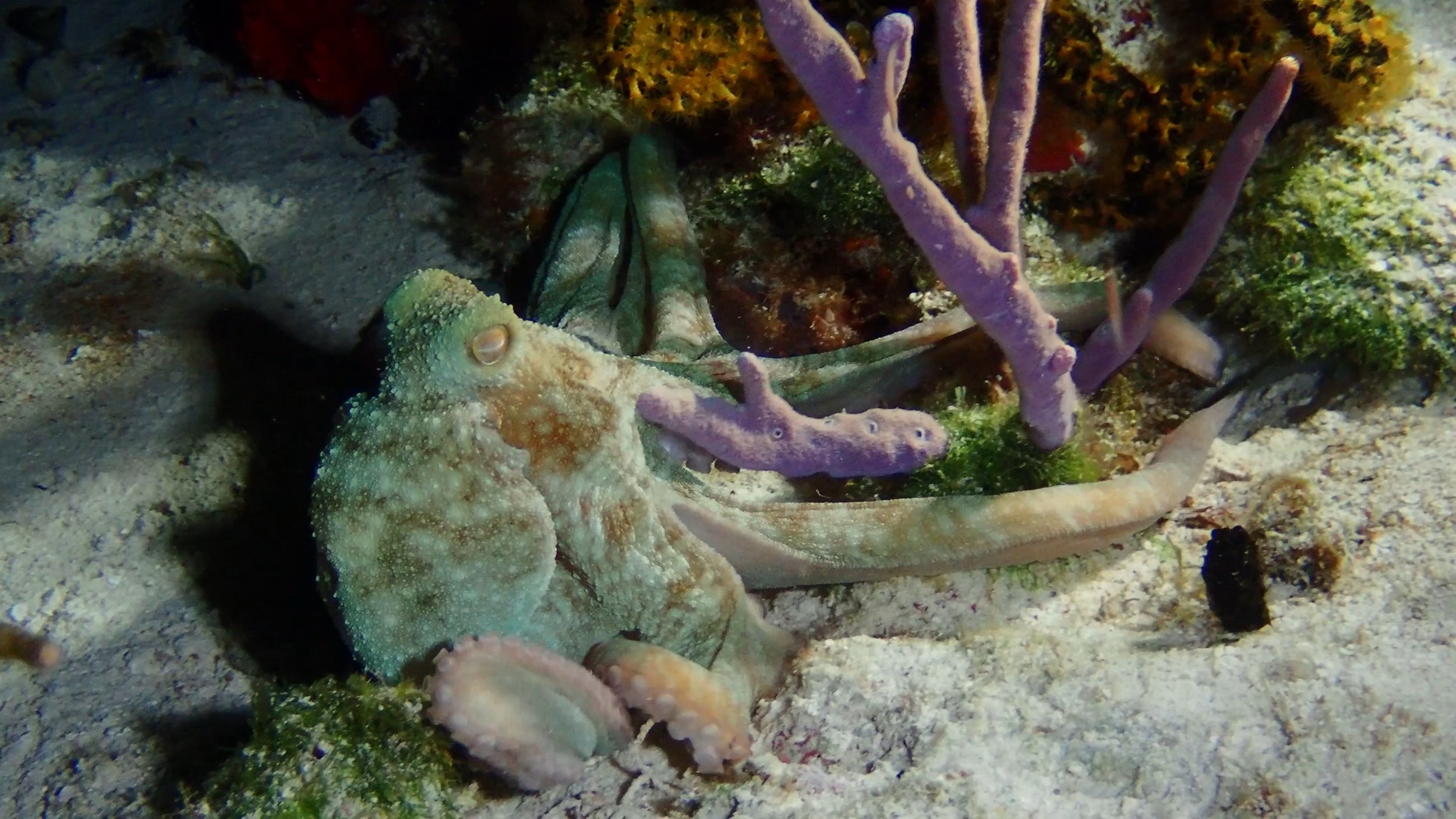 Few ocean creatures as alien as the octopus. Here, a Carribean octopus lets me follow it during a bit of its night hunt.